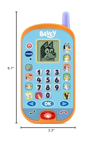Let’s play and chat with Bluey and Bingo on the Bluey Ring Ring Phone. Play games and activities that feature animations of the characters and popular phrases from the show. Press the buttons with pictures of Bluey, her family and friends to hear phrases about each one. Voice activation lets kids chat with Bluey and Bingo for interactive pretend play. Change the ringtone, brightness and more, just like a real phone. Play four games that feature themes from different episodes. If Bingo is in a bad mood, cheer her up by pressing the number buttons to play music she can dance to. Use the arrow buttons to help Bingo do a handstand. When Bluey pretends to be a fruit bat, press the arrows to help her catch fruit to eat. Help Bluey blow bubbles by blowing into the microphone. Let’s do this! Intended for ages 3-6 years. Requires 2 AAA batteries. Batteries included for demo purposes only. New batteries recommended for regular use.